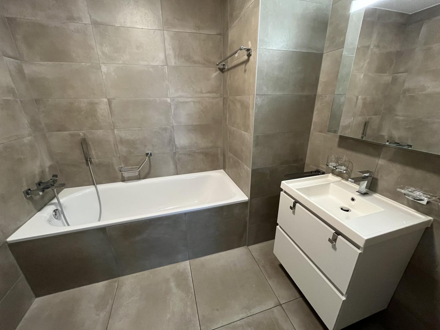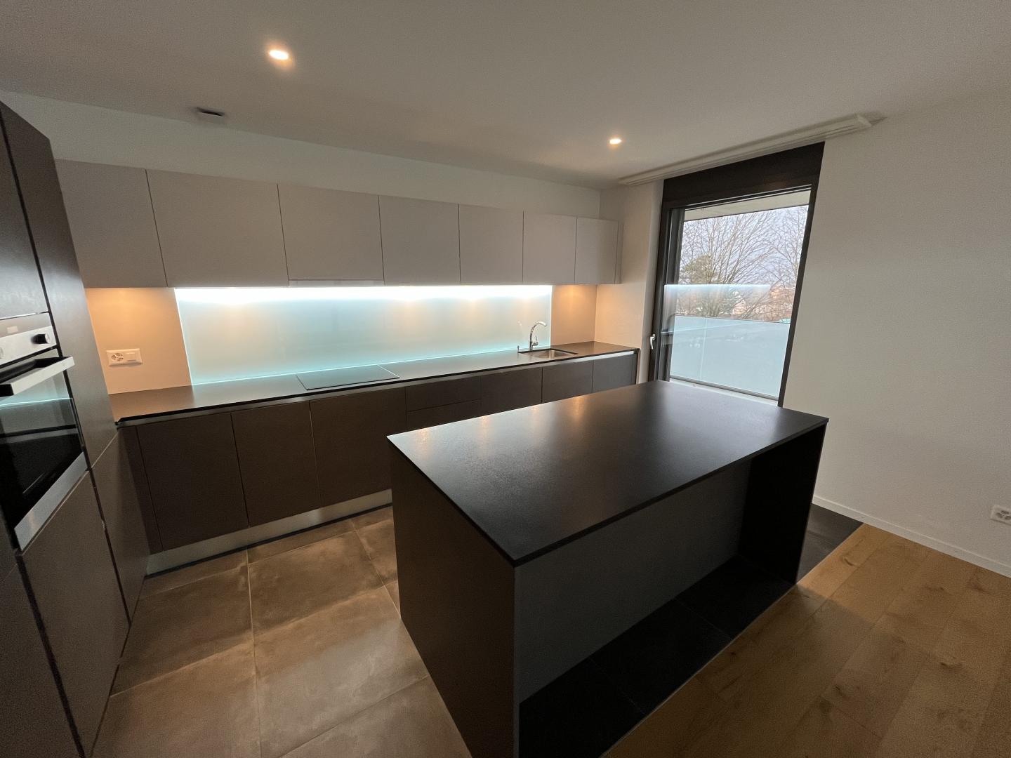 Ce magnifique appartement, de haut standing, spacieux et lumineux, se compose ainsi: un hall d'entrée avec plusieurs armoires murales, un vaste espace séjour-salle à manger avec de superbes baies vitrées, une cuisine ouverte et moderne avec îlot central, deux chambres dont une suite parentale et deux salles de bain (1xWC/douche/lavabo et 1xWC/baignoire/lavabo). Une colonne de lavage est également intégrée et astucieusement dissimulée dans les armoires murales de l'entrée.