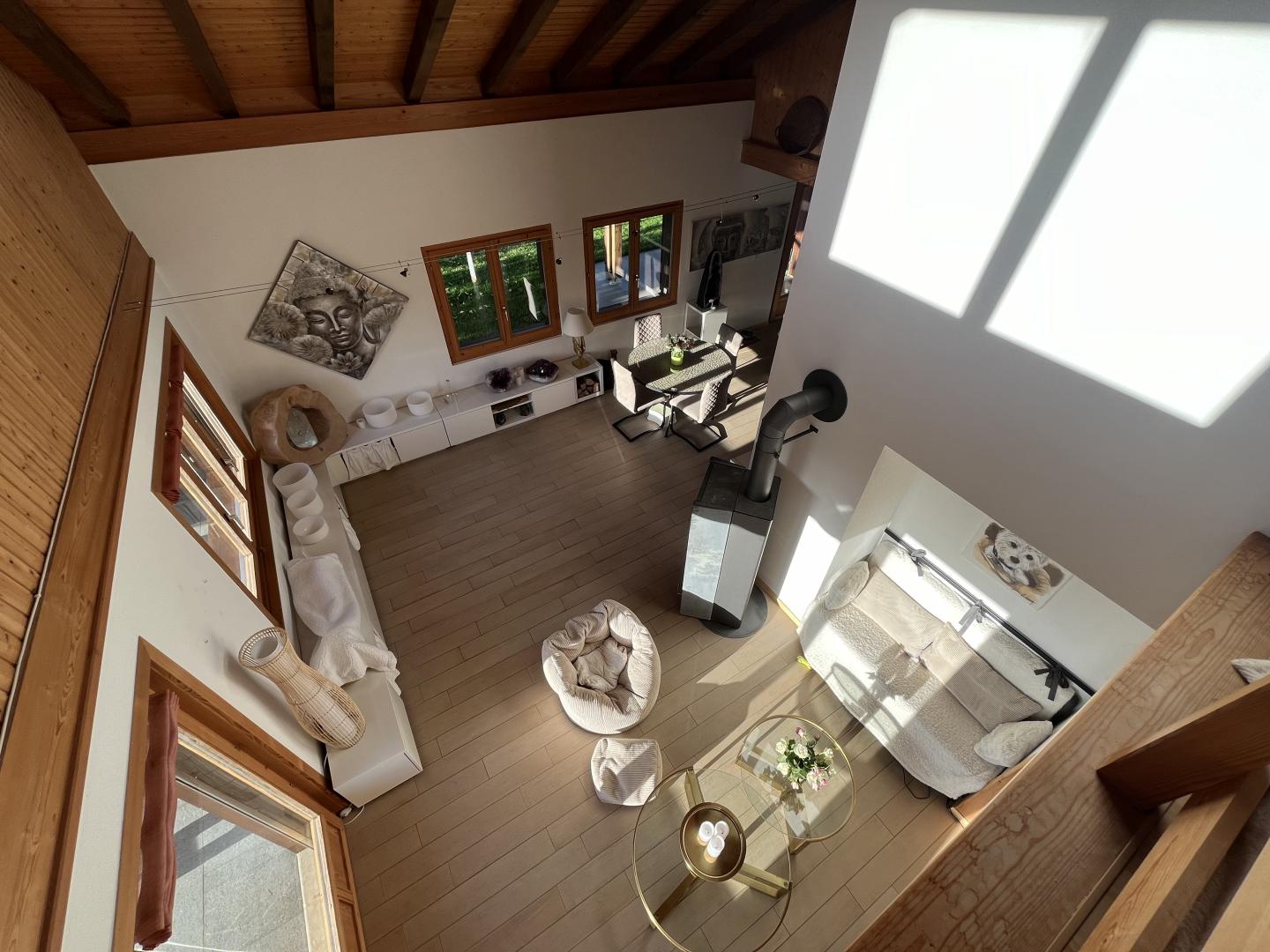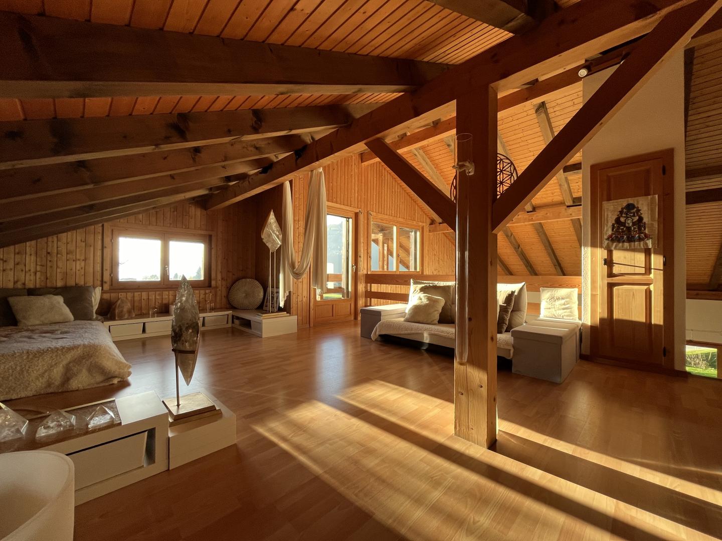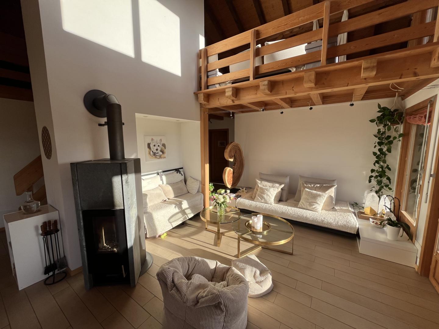 Divers locaux et espaces de rangement, un grand couvert à voiture avec mezzanine pour y stocker du bois, un balcon ainsi que deux magnifiques terrasses viennent compléter ce bien immobilier plein de charme et de cachet.