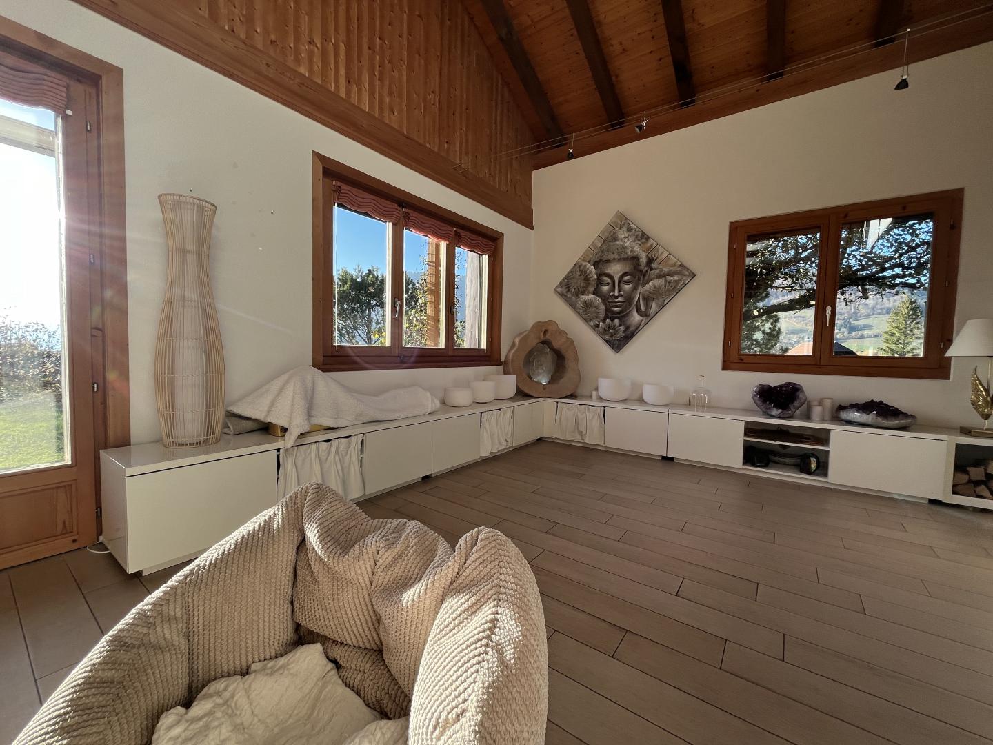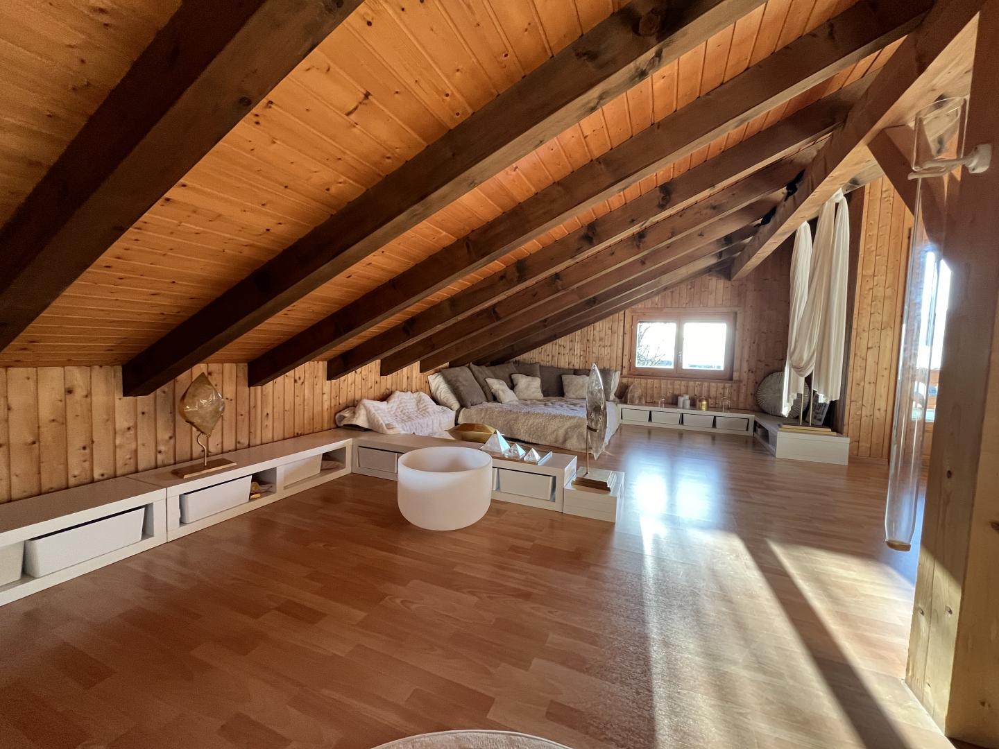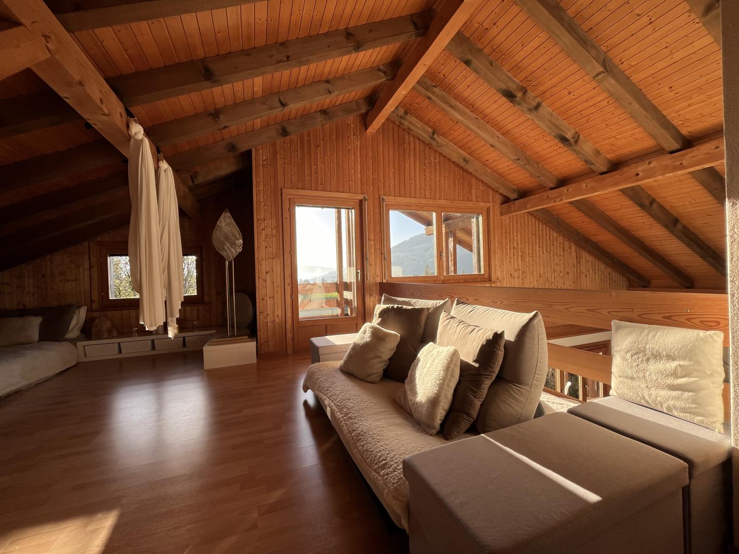 Divers locaux et espaces de rangement, un grand couvert à voiture avec mezzanine pour y stocker du bois, un balcon ainsi que deux magnifiques terrasses viennent compléter ce bien immobilier plein de charme et de cachet.