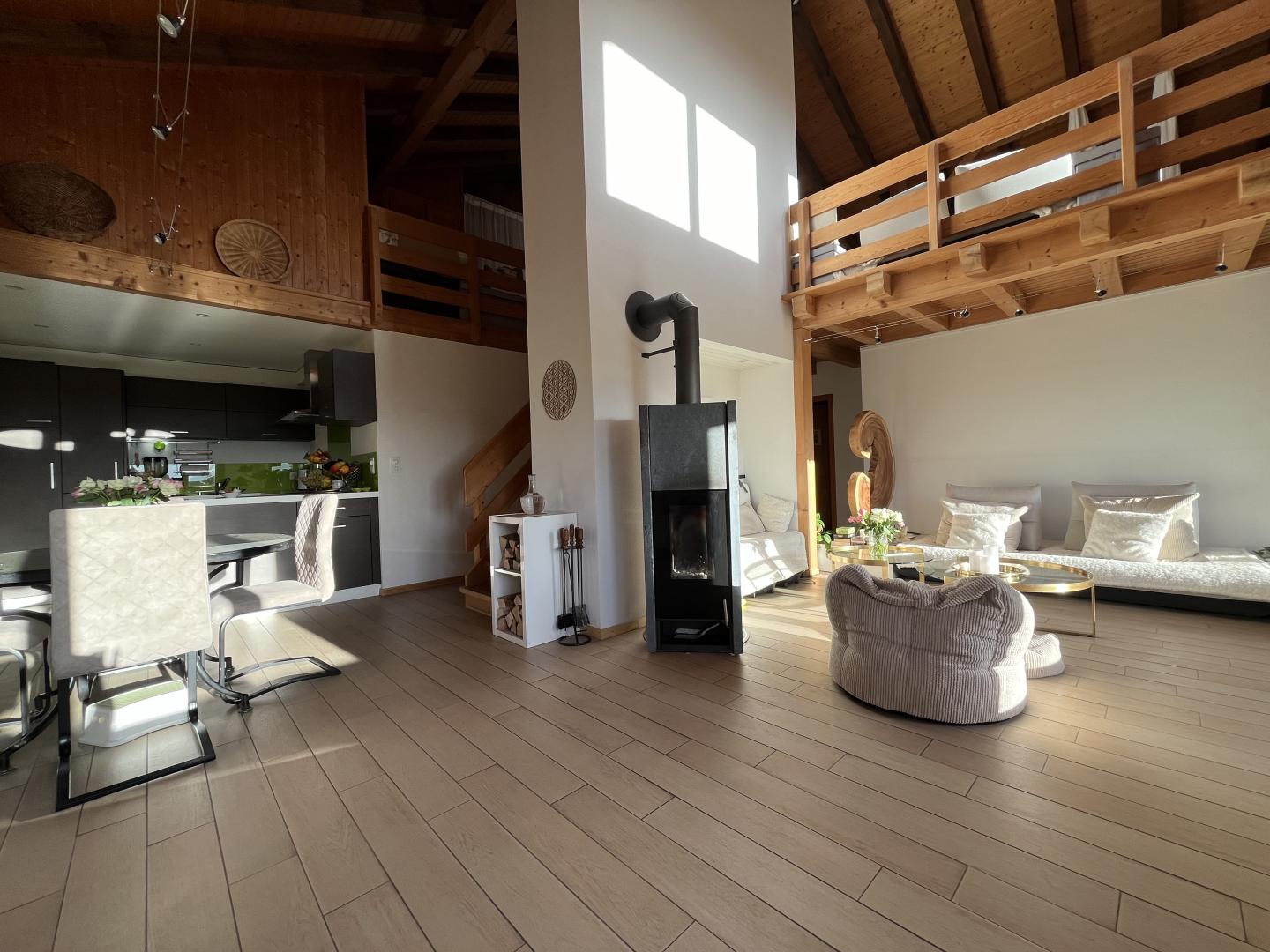 Il se compose ainsi: un vaste et lumineux espace séjour - salle à manger agrémenté d'un poêle suédois, une belle cuisine ouverte, moderne et entièrement équipée avec des matériaux de qualité, une grande salle de bain avec douche à l'italienne, trois chambres à coucher avec armoires murales et une grande mezzanine habitable de 60m2.
