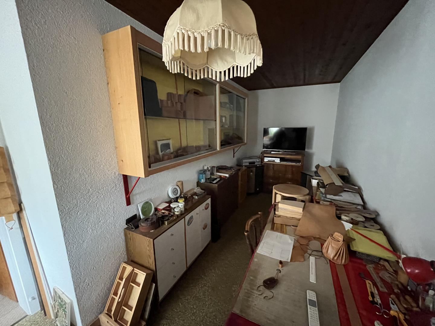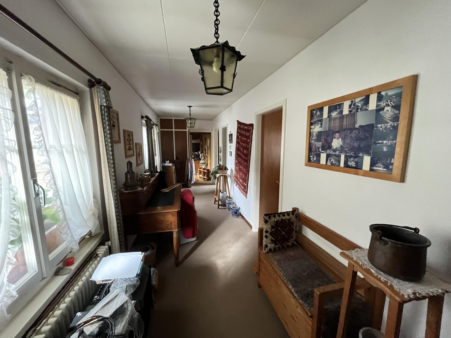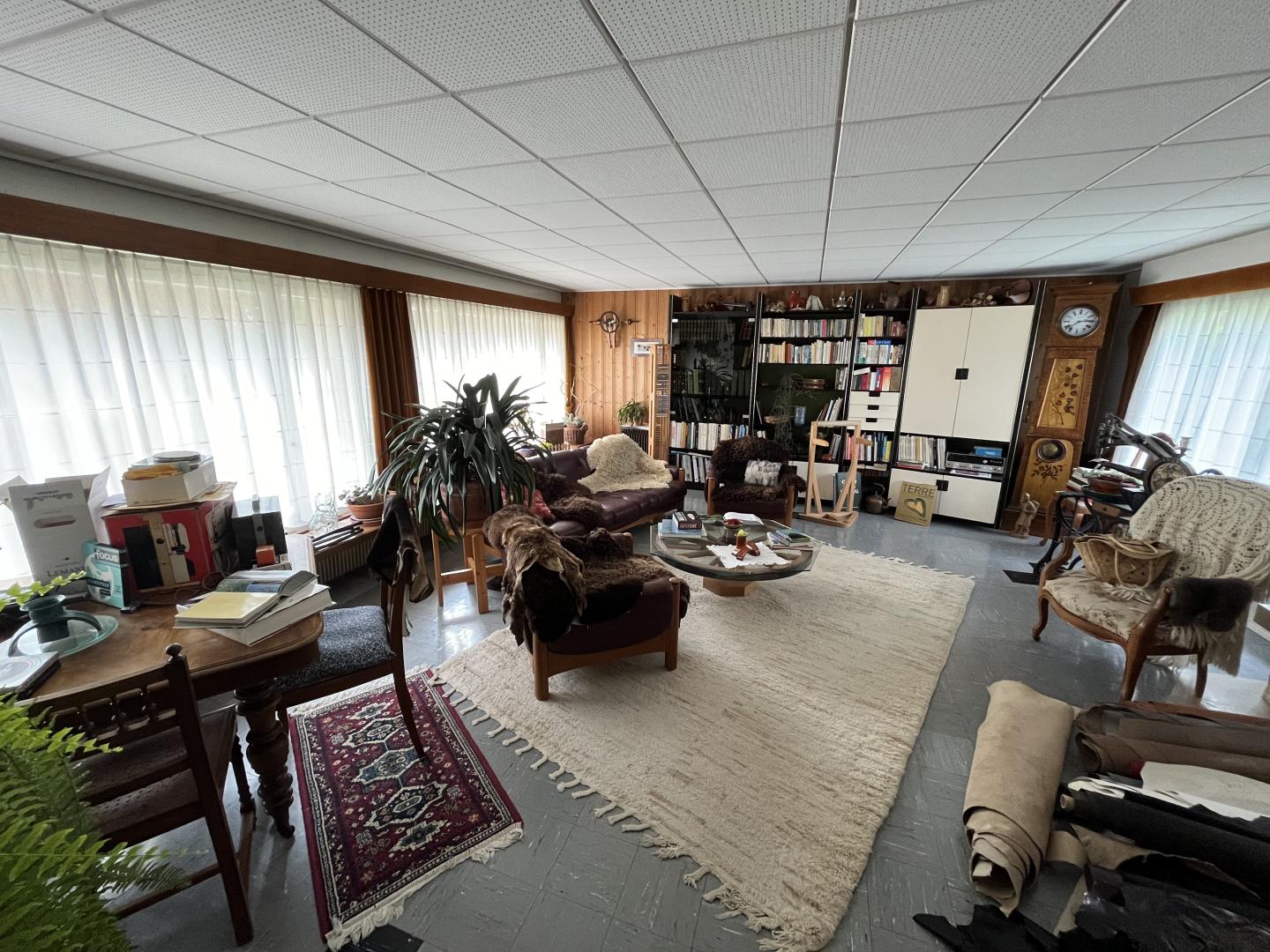 Ce bien immobilier, à vendre AVEC UN DROIT VIAGER, se compose ainsi: un généreux hall d'entrée, un vaste et lumineux espace séjour-salle à manger agrémenté d'une cheminée, une cuisine semi-ouverte, cinq pièces dont trois sont actuellement aménagées en chambre à coucher, deux salles de bain (1x WC/douche/baignoire + 1x WC/douche), un local technique avec buanderie et divers locaux-espaces de rangement. Accès à un grand galetas depuis la dernière pièce (escalier en bois).